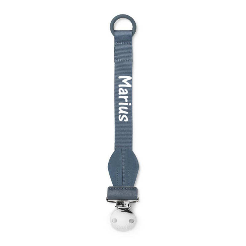 Den fine sutteholder har en flot rund sølvklips med Elodie graveret i, som den sættes fast med. Den er nikkelfri og selvføgelig velegnet til baby brug. Der er søde kanin ører nederst på.