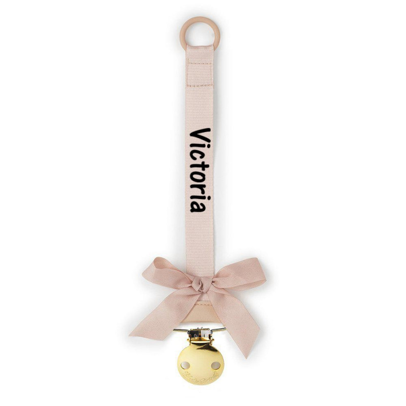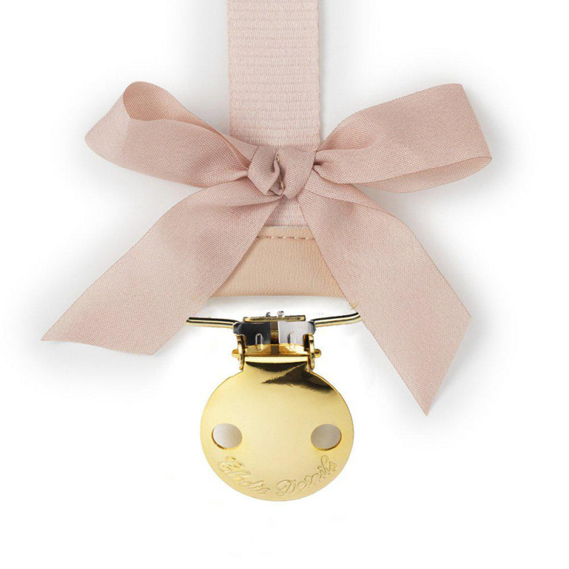 Den fine sutteholder har en flot rund guldklips med Elodie graveret i, som den sættes fast med. Den er nikkelfri og selvføgelig velegnet til baby brug. Der er søde kanin ører nederst på.