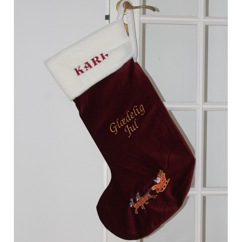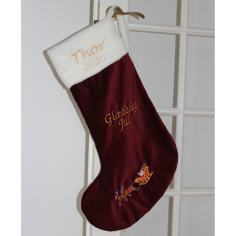 Vælger du rød tråd til denne julestrømpe broderer vi med mørkerød, så matcher den mørkerøde velour.