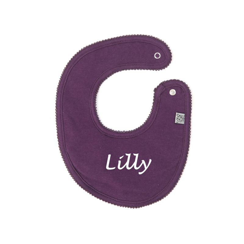 Small stuff mørkelilla savlesmæk med navn broderet på.