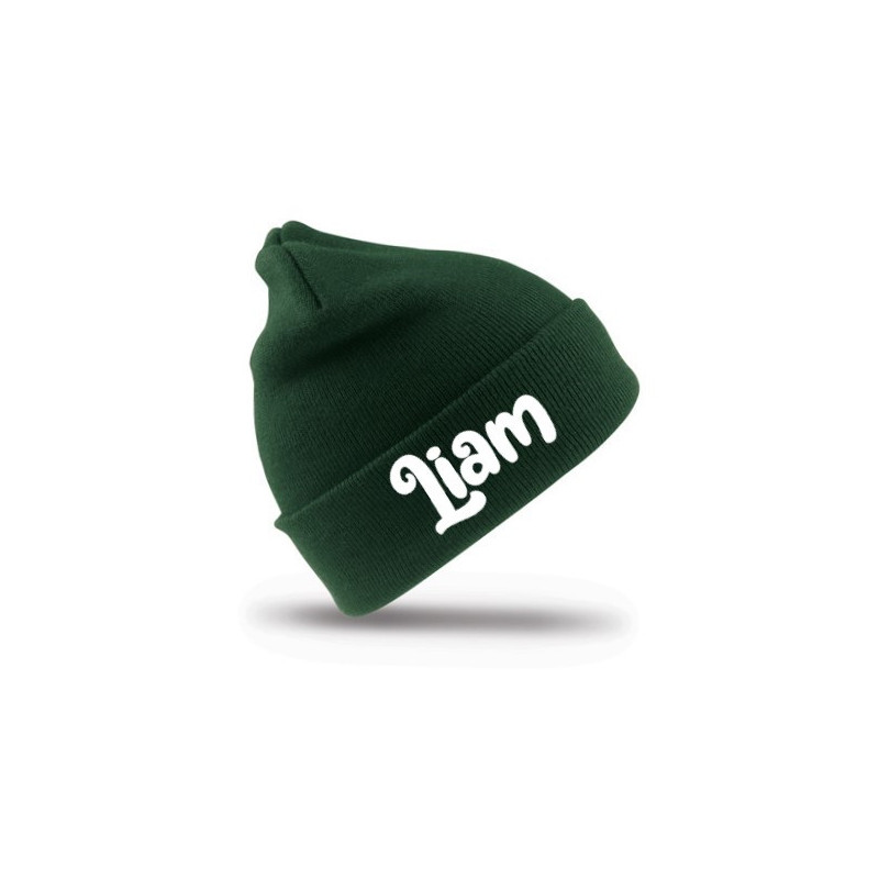 Du kan få brodering op til 2 linjer. Der broderes max 10 bogstaver pr. linje, af hensyn til størrelsen. Vi anbefaler en tyk/kraftig skrifttype, det egner sig bedst til strikhuen.