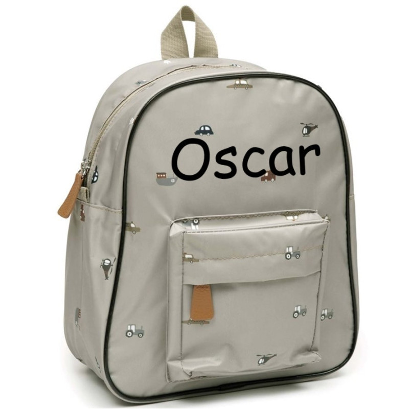 En flot rygsæk i grå med små køretøjer, som mange børn elsker. Tasken passer rigtig godt til børn fra ca. 2 år og er oplagt som både hverdags- og turtaske i vuggestue og børnehave.